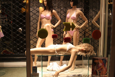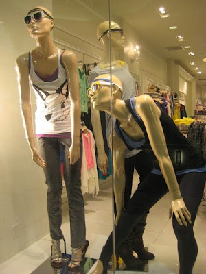 Paris is not much better. I took this photo of a storefront on the Champs-Elysees in Paris. I thought that one laying down was staring at me. Now I’m convinced she was taking note of my American accent and what bags I was holding. (“Stupid Americans will come all the way to the fashion capital of the world to go to H&M.”)