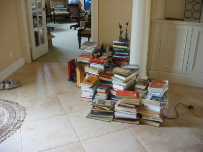 I actually love putting away books, because we have some really good novels. Our non-fiction stinks, but the fiction is awesome. This is partly due to a mission I began about two years ago to buy as many paperback classic fiction books as I could, so that when the kids came running into the kitchen at 8 p.m. on a Sunday night, yelling, “I have to read The Iliad orThe Odyssey or a John Grisham book that’s at least 250 pages long by tomorrow!” I’ll be prepared. (That scenario is not uncommon. English teachers and summer reading professionals have a weird sense of what’s literature. Either that or they drink whole bottles of vodka when they’re doing their lesson plans. Preferably, I can whip out The Iliad in lieu of The Firm.)
