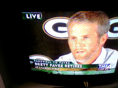 I’m telling you, if I have to see Brett Favre cry on TV one more time, I’m going to have a minor breakdown. That’s got to be the saddest, most heart-wrenching thing since The Crying Indian on the Keep America Beautiful commercial.