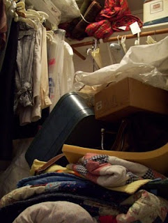 Sometimes the smaller the house the more messy it is, just because there’s no place for your junk to spread out. In our last house, if I wanted to save something, there were spare rooms all over the place in which to stash catalogs, old campaign buttons, ticket stubs for memorable shows, and clothes that don’t fit me and have shoulder pads and jewel tones.