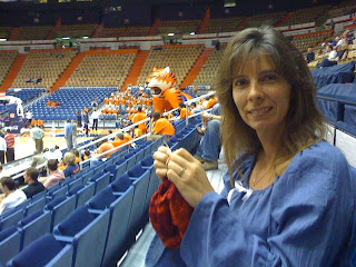 It’s too bad, really, that it’s such an image breaker. Because there are some circumstances where knitting should be the perfect thing to pass the time. For example, waiting for your kid’s basketball game to start. You have to get him there 45 minutes early for warm-ups or you’d run the risk of being one of Those Parents. It’s a waste to drive all the way home and back, plus if you did that, you might find that almost anything you do at home is more rewarding than watching your child poke and fidget on the bench; and if you never went back, you’d definitely be one of Those Parents.