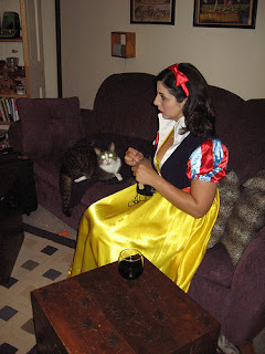 Snow White found that knitting booties for her forest friends and drinking wine helped pass the time while she waited for the dwarves to get ready for work.