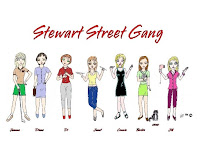 Two is something to wear Sunday, which I think is going to be my Stewart Street Gang t-shirt and some capri pants. The t-shirt is one that gang member Janet designed and had made for us. It shows the seven of us being our stereotypical selves. Janet was very kind. First off, she made us all extremely thin and cute. We look like we’re 20 and have never had a stressful day in our lives. Plus we have those anime big eyes, which is a huge improvement over the shrinking squintables that I have.