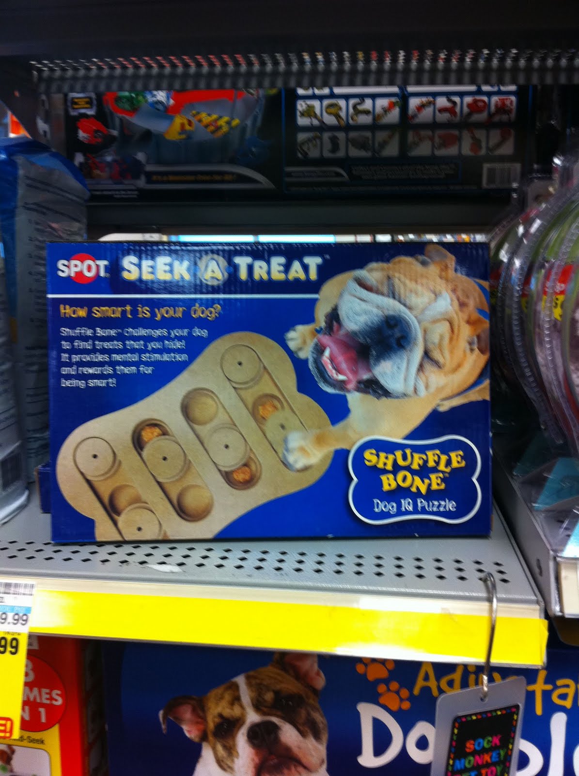 Who needs opposable thumbs to do puzzles? Don’t believe the look of pure joy on that dog’s face on the “Seek-a-Treat” box. No self-respecting dog I know would get a kick out of earning treats this way. What do you think he’s saying? I’m going with, “I’ll shuffle your bone . . .”