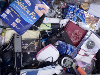 ◉ Chargers for small electronics that I can’t match up with items. I’ve got a box of 16 of them, all black, all with different male parts that don’t match up to any female cell phones or MP3s or Gameboys in our house. Uh-buh-bye.